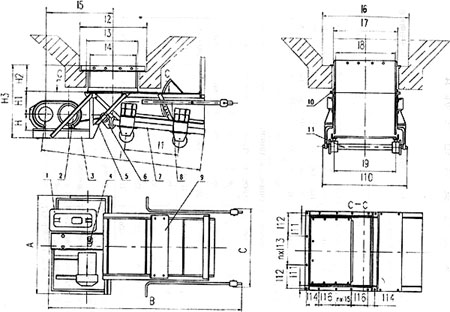 KK型往復(fù)式給煤機(jī)由機(jī)架、底板(給煤槽)、傳動(dòng)平臺(tái)、漏頭號(hào)、閘門、托輥組成,當(dāng)電機(jī)開動(dòng)后經(jīng)彈性聯(lián)軸器、減速機(jī)、曲柄連桿機(jī)構(gòu)拖動(dòng)傾斜5度的底板在輥上作直線往復(fù)運(yùn)動(dòng),煤均勻地卸到其它設(shè)備上。本機(jī)可根據(jù)需要設(shè)有帶漏斗、不帶漏斗兩種形式。